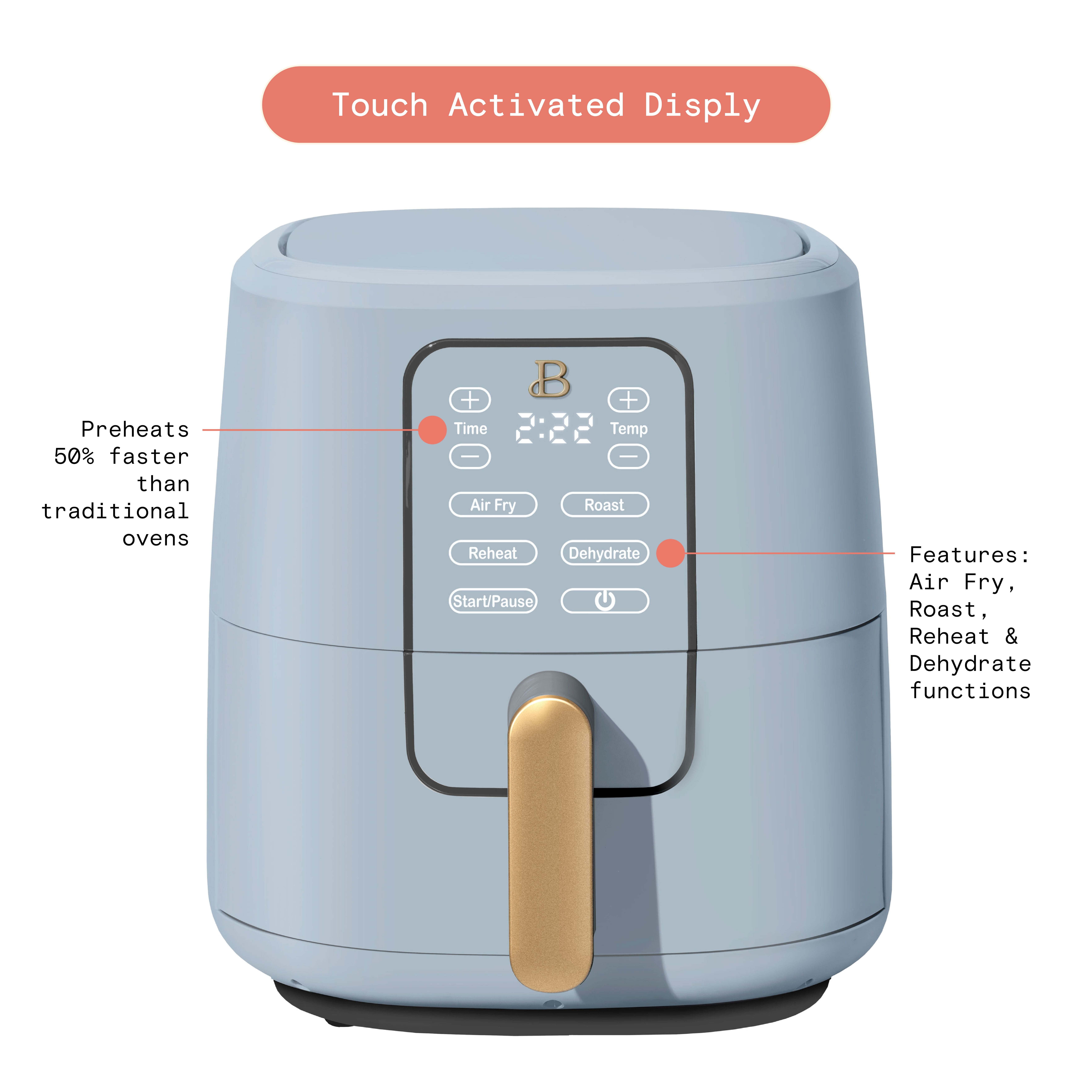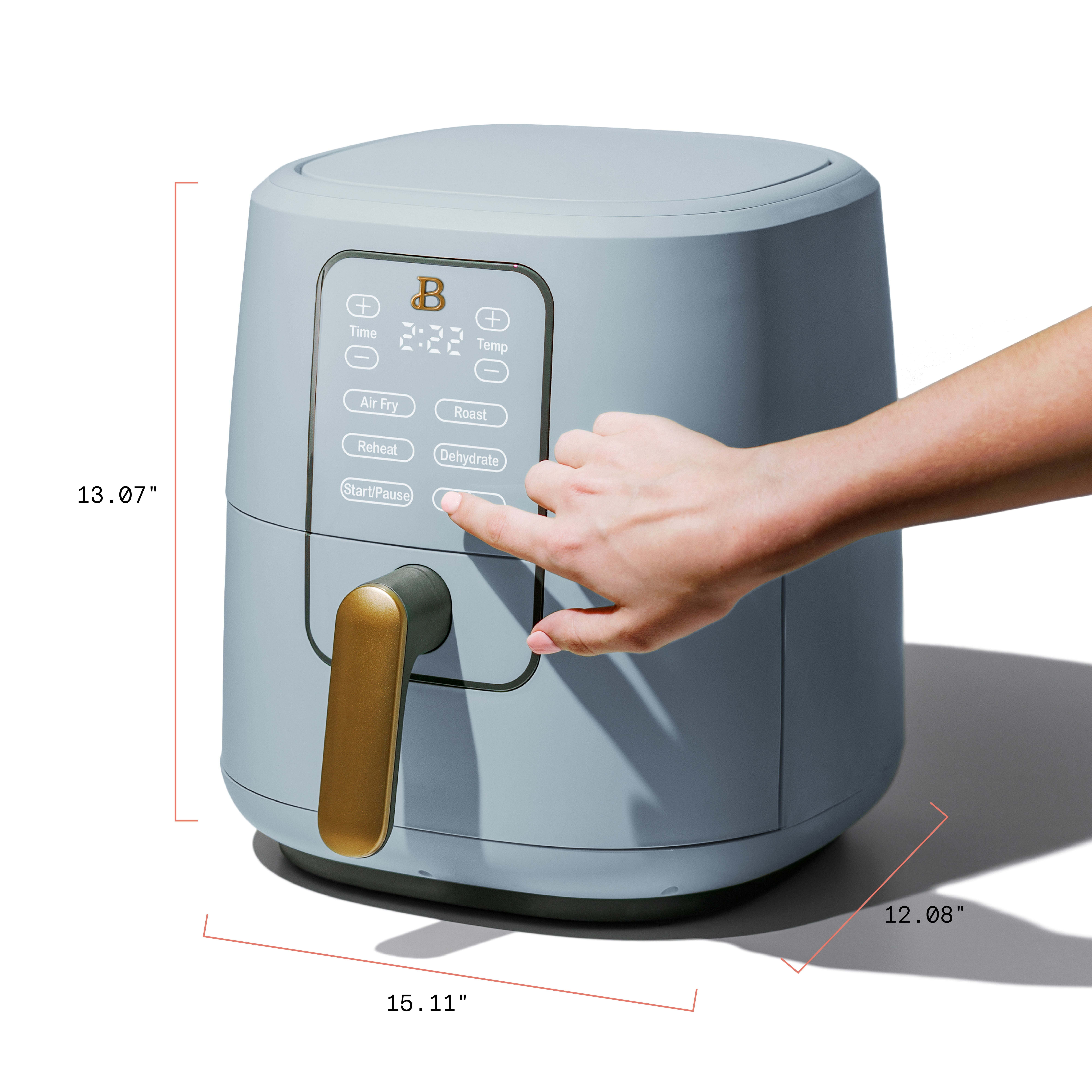 Our signature touch-activated display illuminates only when you need it. No dials, buttons or knobs.Powerful 1700w system with stainless steel provides faster heat-up and cool-down times.High Performance Circular Heat Technology and nonstick crisping tray promote fast, crispy, evenly-cooked meals.Large 5lb (2lb French fry) food capacity is ideal for chicken wings, small roast chickens, pastries, burgers and more.Air fried favorites have 88% less fat and 65% fewer calories than restaurant-fried foods.60-minute automatic shut-off function adds safety and peace of mind.Removable crisping tray and pan are dishwasher safe and PFOA/PFOS-free for fast and easy clean-up.