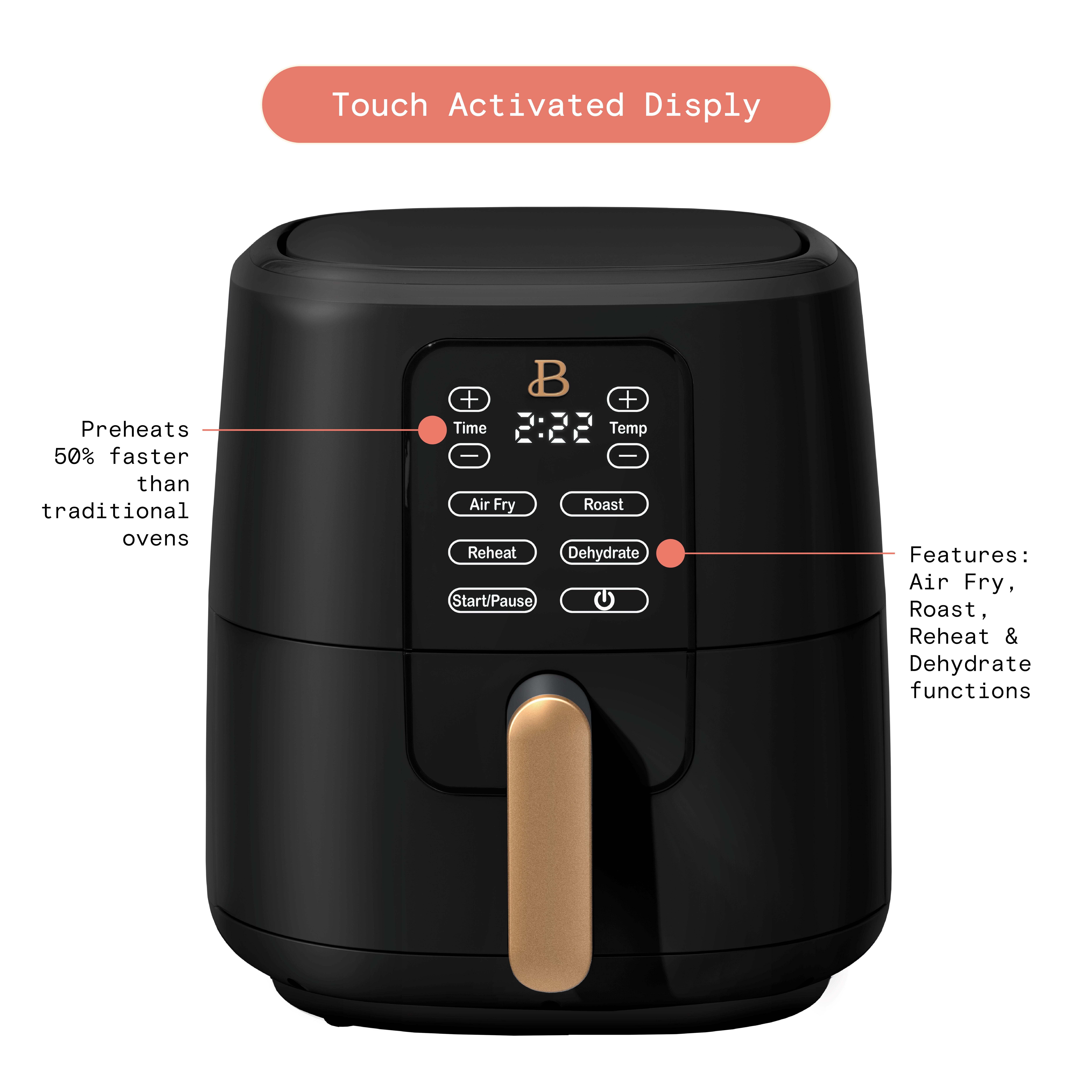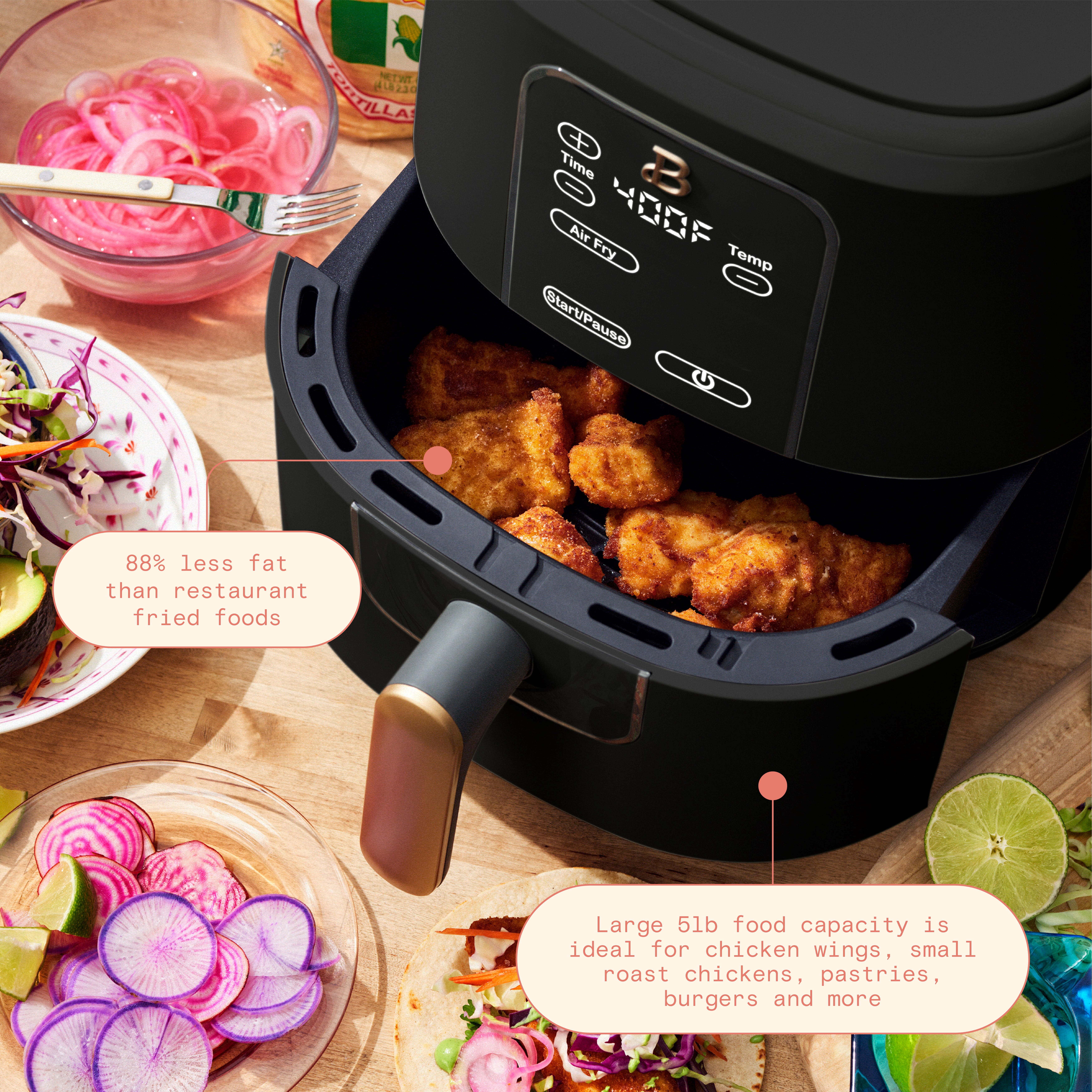 Our signature touch-activated display illuminates only when you need it. No dials, buttons or knobs.Powerful 1700w system with stainless steel provides faster heat-up and cool-down times.High Performance Circular Heat Technology and nonstick crisping tray promote fast, crispy, evenly-cooked meals.Large 5lb (2lb French fry) food capacity is ideal for chicken wings, small roast chickens, pastries, burgers and more.Air fried favorites have 88% less fat and 65% fewer calories than restaurant-fried foods.60-minute automatic shut-off function adds safety and peace of mind.Removable crisping tray and pan are dishwasher safe and PFOA/PFOS-free for fast and easy clean-up.