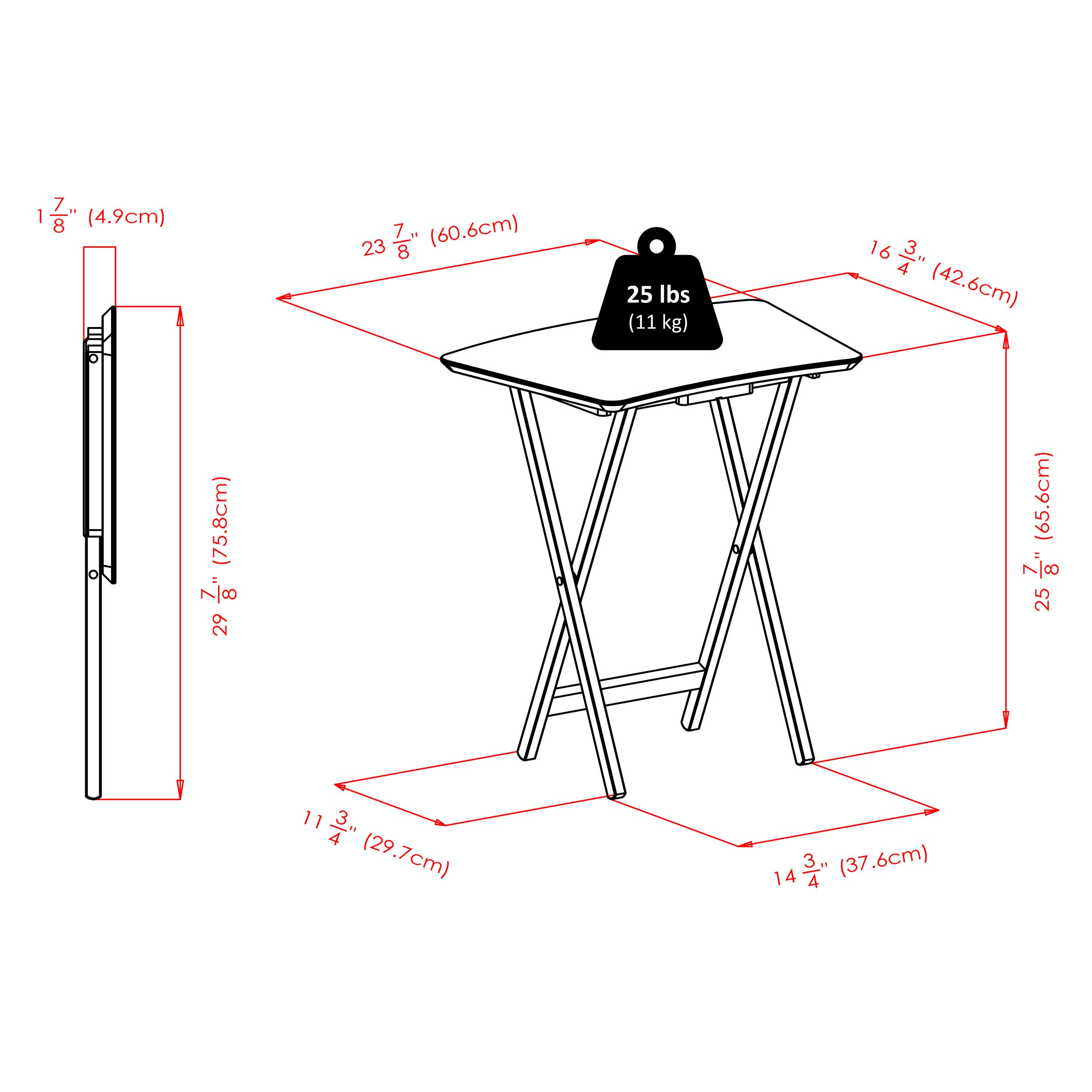 This versatile set includes four folding snack trays with beveled edges that show off the gently curved fan shape; and with the longer arc you get even more tabletop space. Ideal for entertaining; setting out appetizers; so bring out the set and pull up the tables as you and your guests sit back with these lovely designed tables on which to place their drinks and plates. Great for daily use and compact enough to store in the closet. For convenience an upright stand is an innovative addition to this set as it serves as a rack to store the folded tables discretely when not in use. Constructed of solid and composite wood in a deep coffee finish; this set of foldable tables easily open up to X-frame bases which make these table not only look good but also help with stability. Conveniently packed and shipped in 1 box. Tables arrive ready to use and require no assembly. Minimal assembly is required for the stand and hardware necessary is included. Replacement part request can be submitted directly to the manufacturer within 60 days from date of purchase.