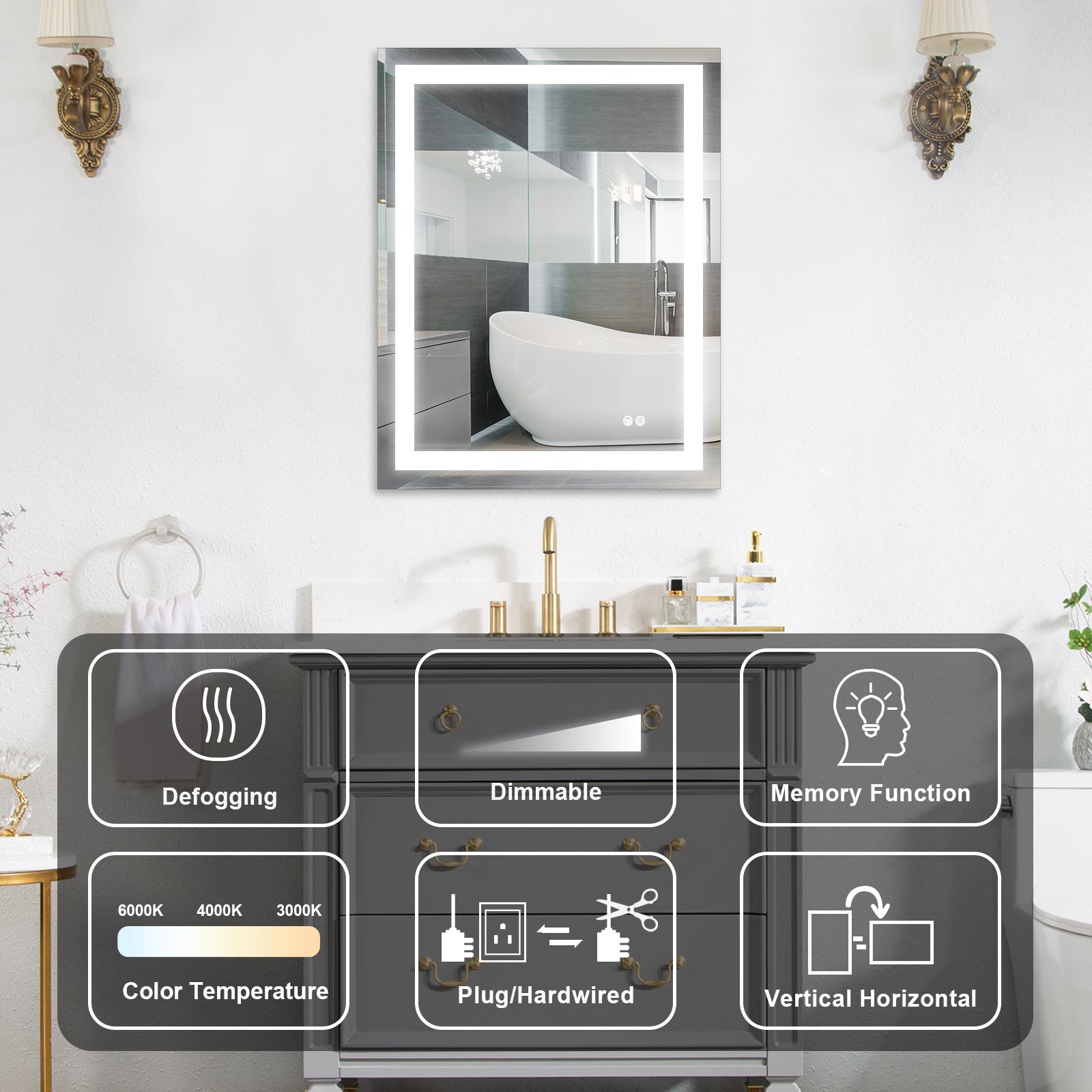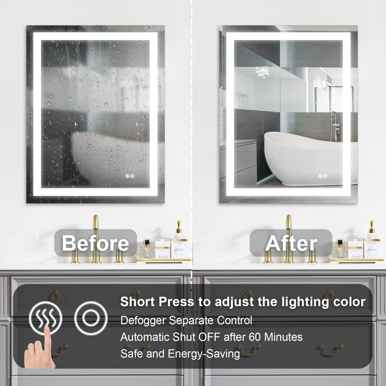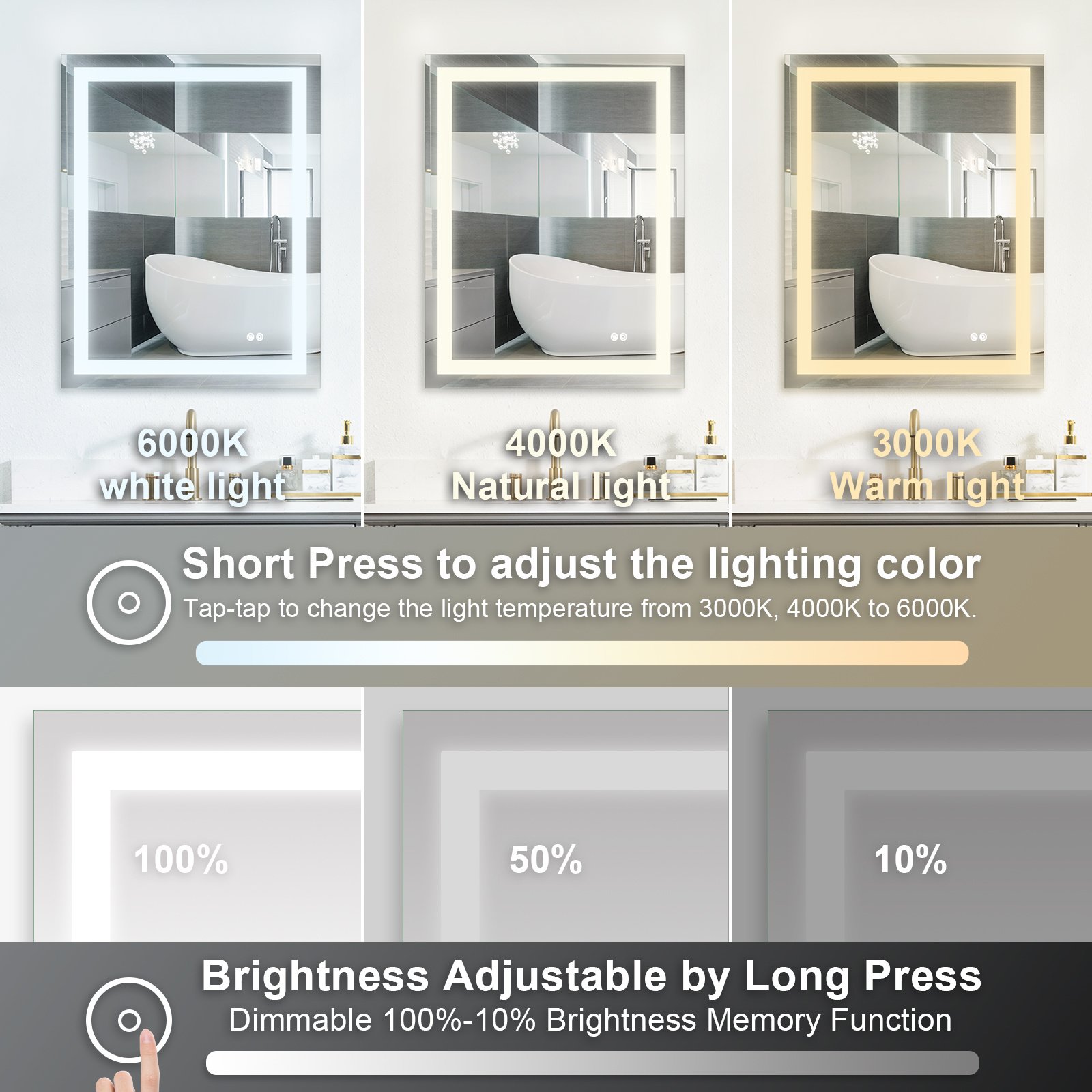 The bathroom mirror with LED light; Made of high qualit Anodized aluminum can be used for long time. High tech Intelligent bathroom vanity makeup mirror with defogging function. Touch sensor button can adjustable mirror color brightness from 2700K-6300K to meet the needs of different light. Brightness can be adjusted freely from 10 % to 100%. Large size bathroom mirrors wall mounted design; it is space-saving. Bright mirror can make your bathroom or living room can be more spacious; Better mood. Perfect for bathroom; bedroom; dressroom; powder room and more.