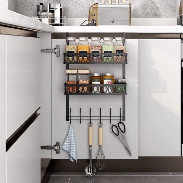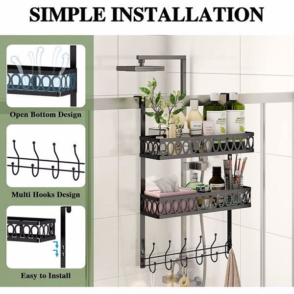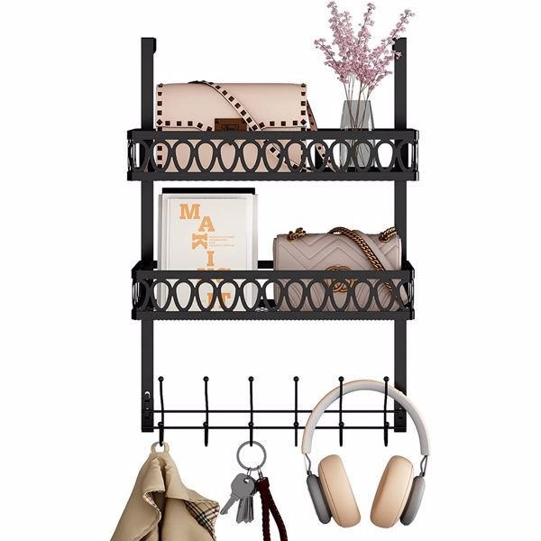 Hooks on the door to hang clothes; towel rack on the door with 2 baskets; coat rack on the door bathroom organizer; black