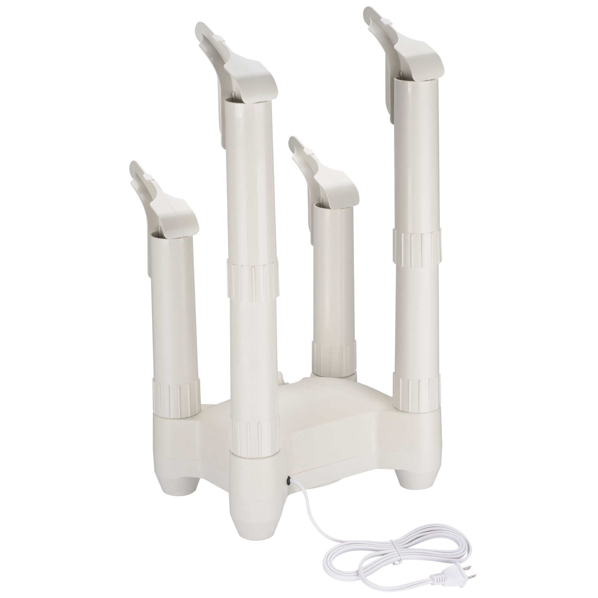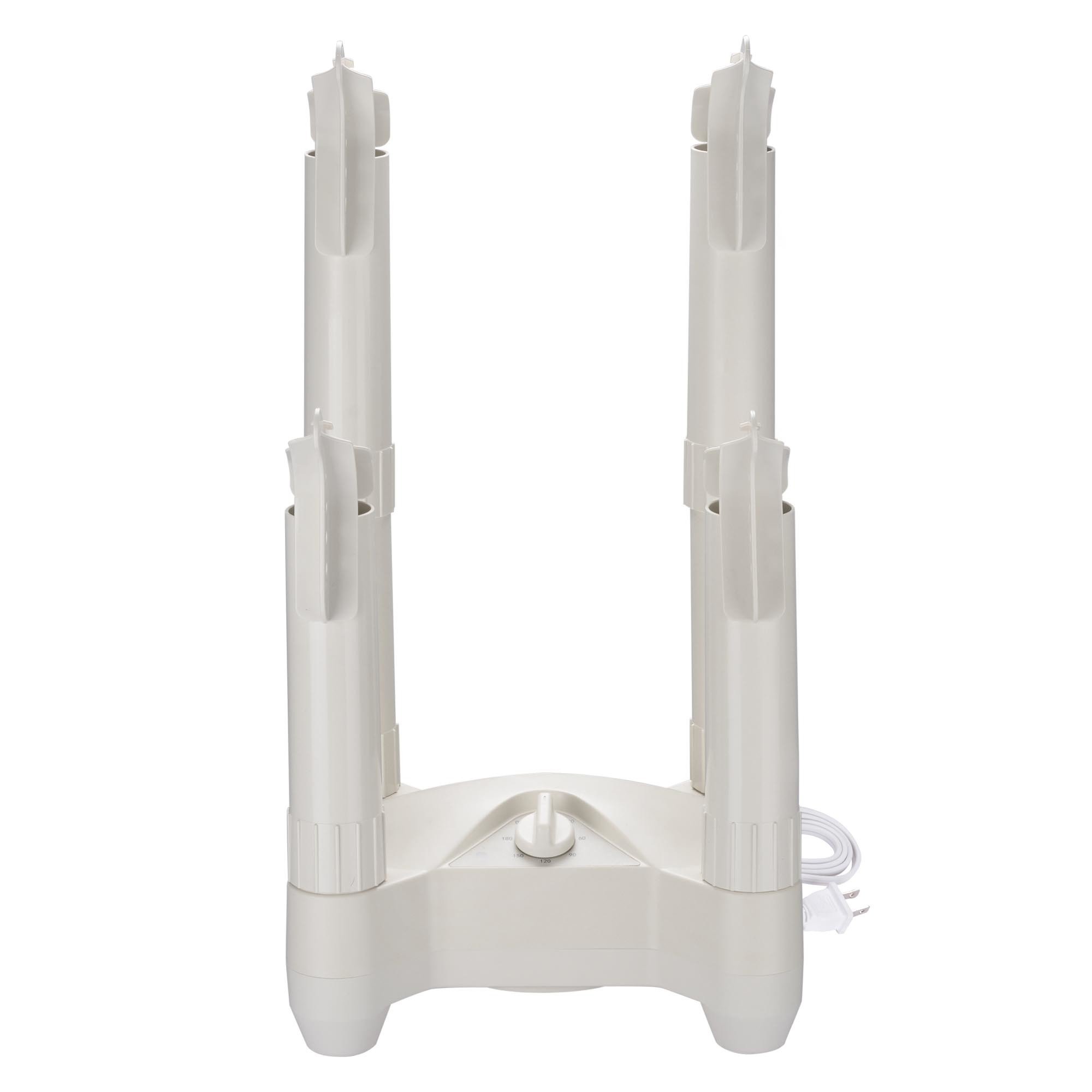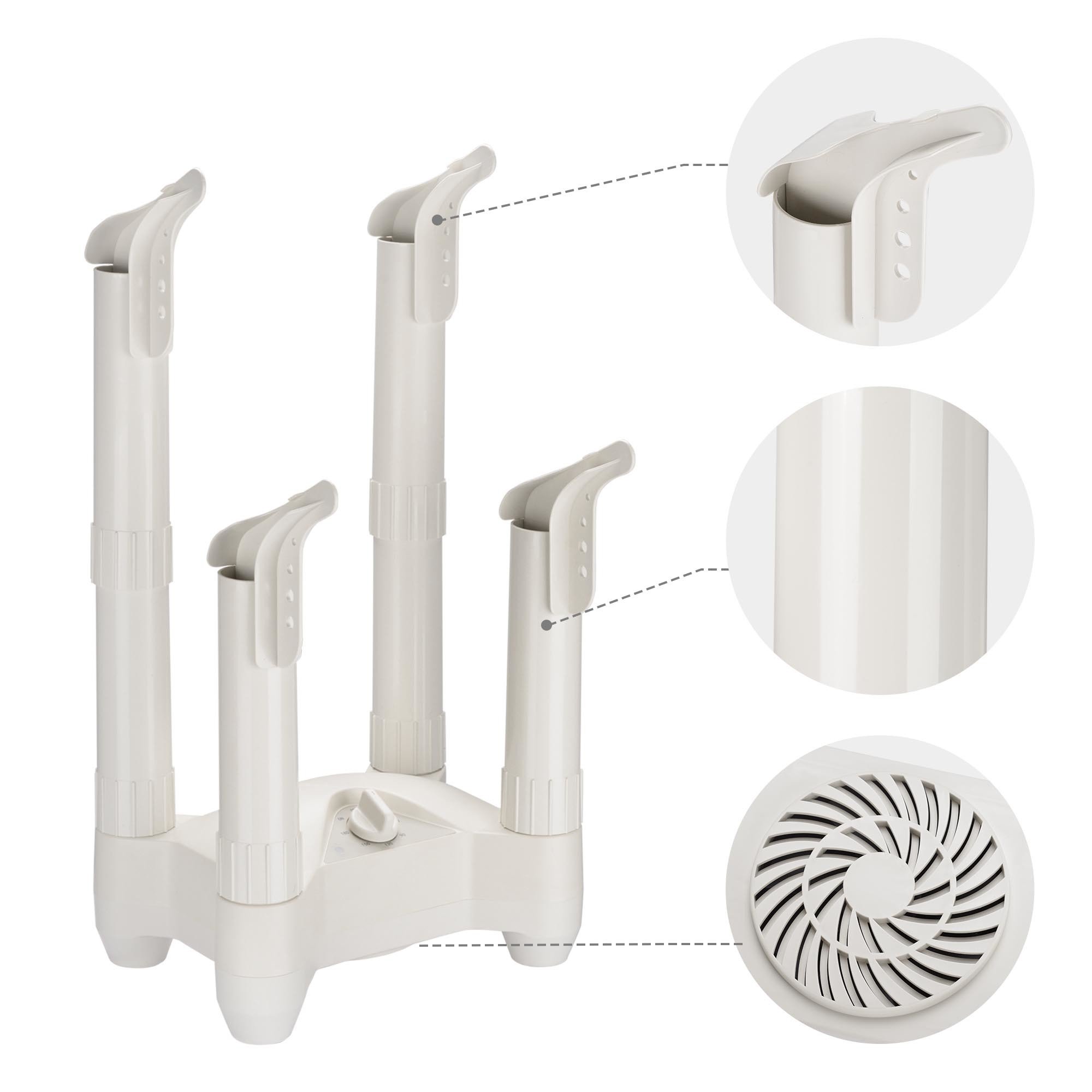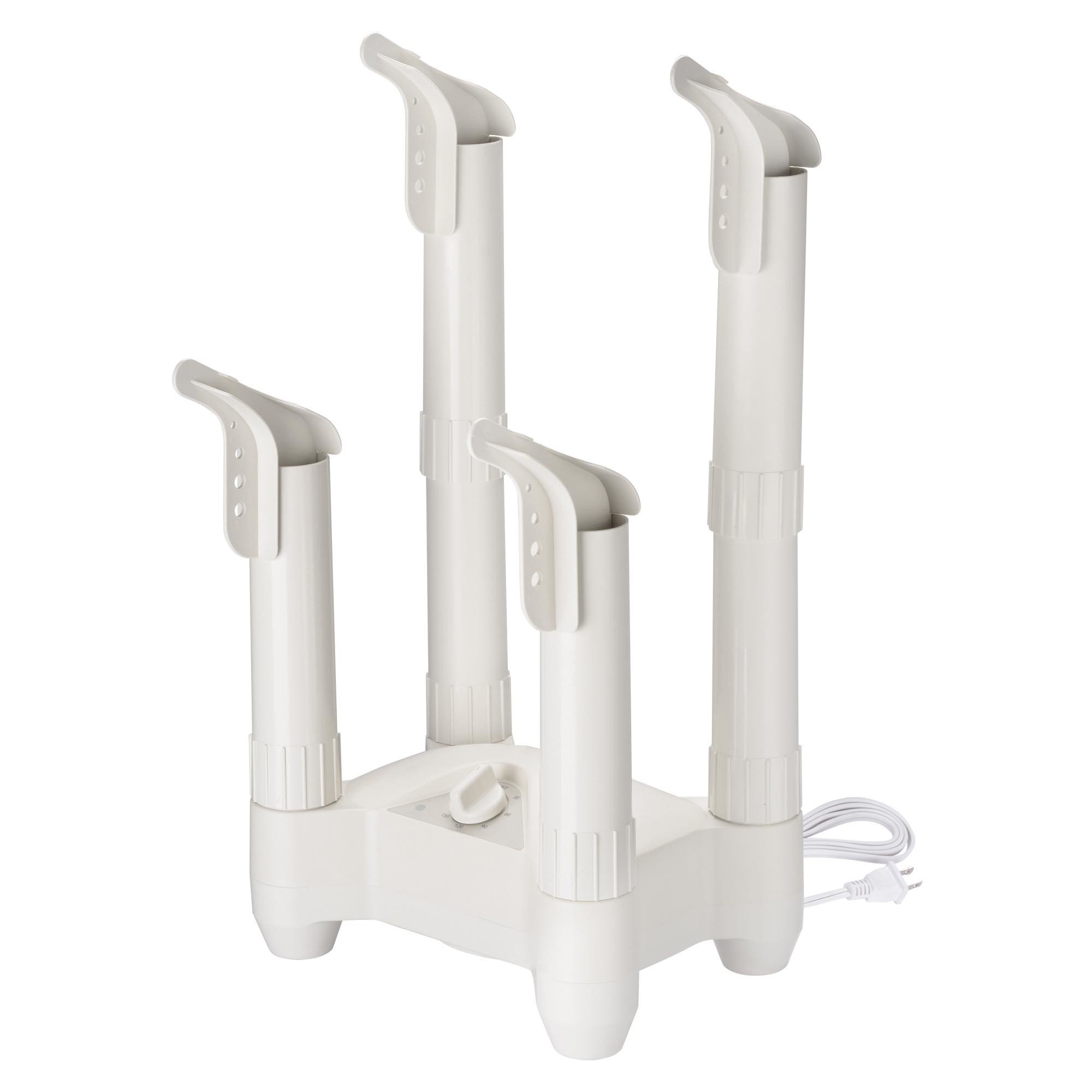 - Multifunctional Dryer & Deodorizer - Electric Shoe Dryer features 4 air outlets to dry 2 pairs of footwears or gloves at the same time, 2 extra tubes for heightening to hold boot; Effectively dry out leather, rubber, canvas, neoprene, synthetic fiber, cloth, felt and wool; No more damp shoes in humid weather, keep them dry and warm, heating up for less germ to deodorize